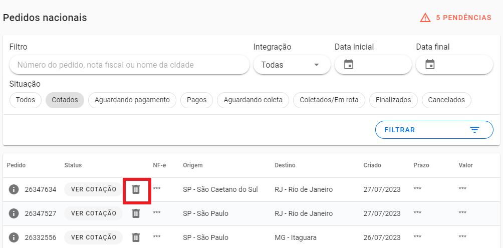Caso o pedido tenha sido apenas cotado, sem seguir com a finalização até a escolha da forma de pagamento, dentro do seu cadastro na aba de PEDIDOS > NACIONAL > COTADOS, é possível fazer o cancelamento. Conforme imagem abaixo: