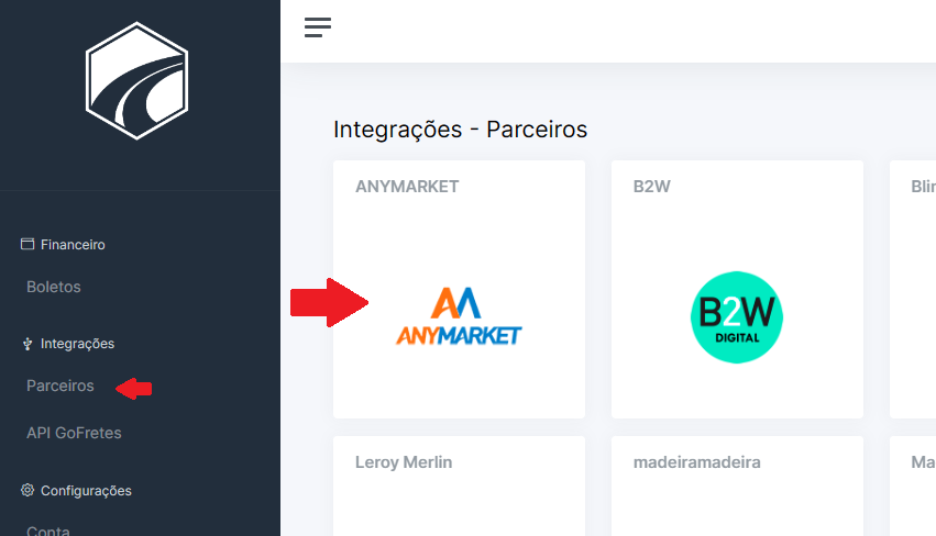 Dentro do Painel, procure no menu lateral a opção de Parceiros e selecione Anymarket