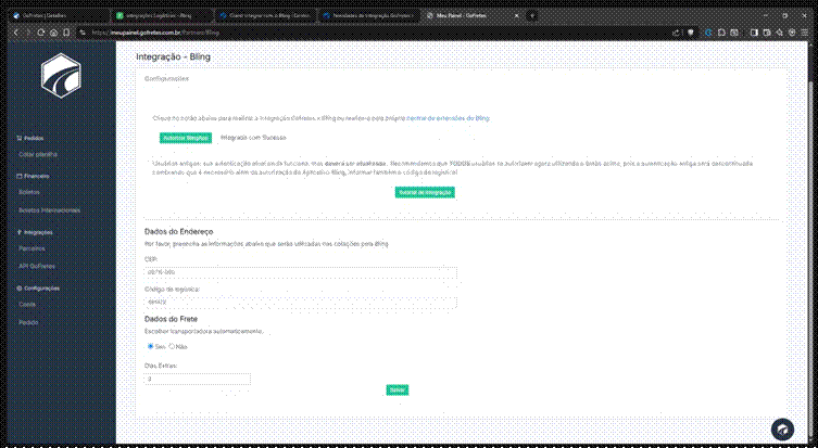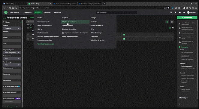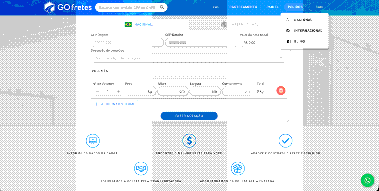 Agora acesse a sua conta GoFretes, clique em Pedidos > Bling!