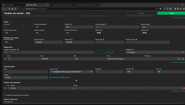 Com esses dados, volte para a plataforma da Bling! e acesse Vendas > Pedidos de venda para incluir as informações da nota fiscal e salvar.
