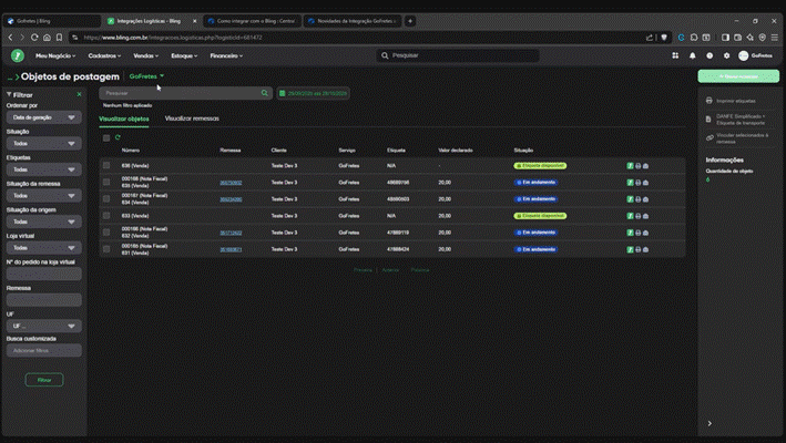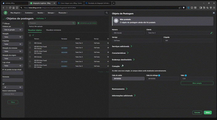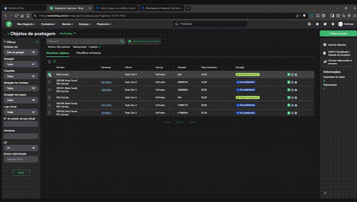 Ao acessar essa tela, todos os pedidos da GoFretes que você escolheu na tela anterior ficarão disponíveis em Objetos de postagem.