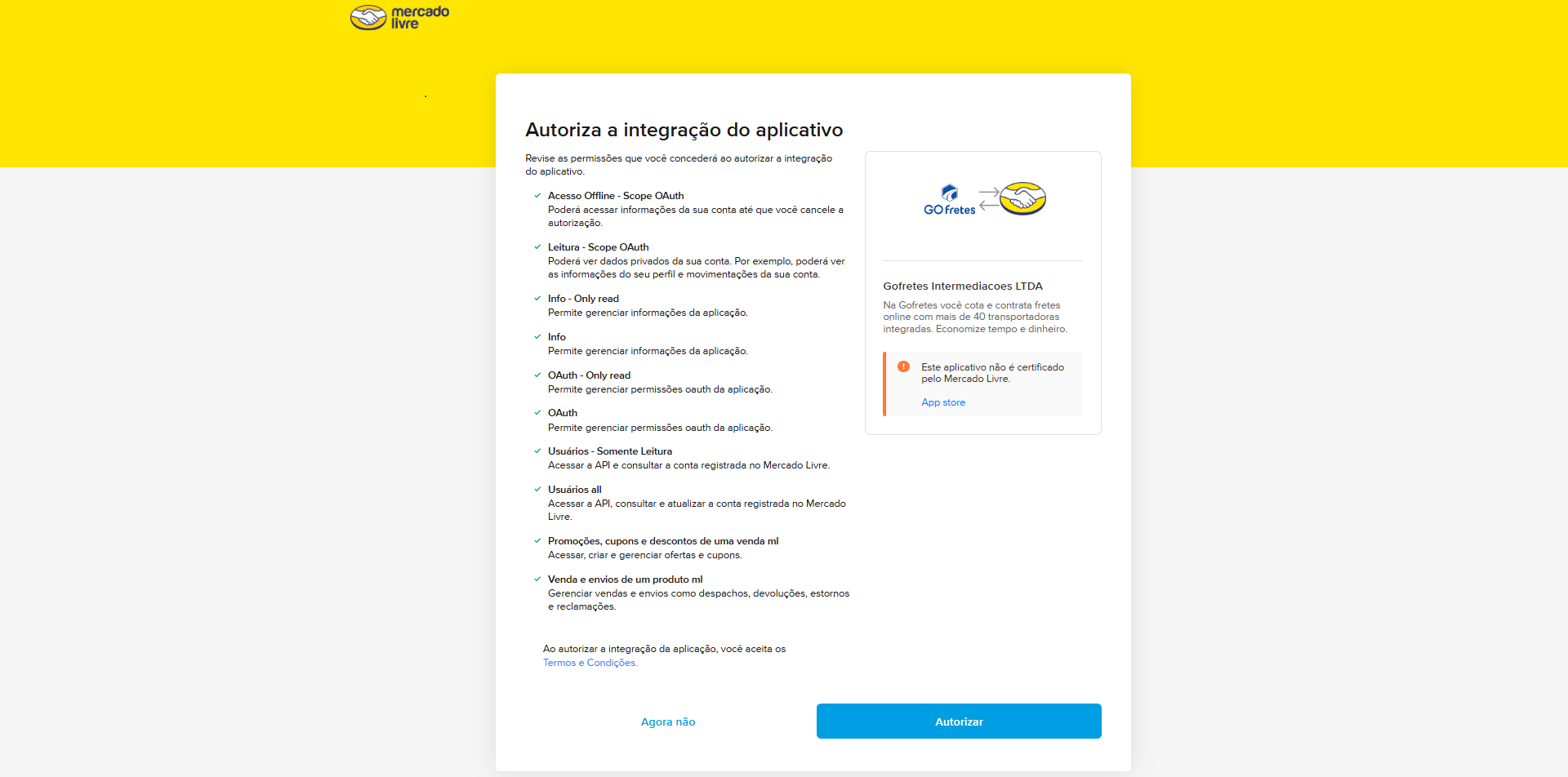 Clique em Autorizar App do Mercado Livre