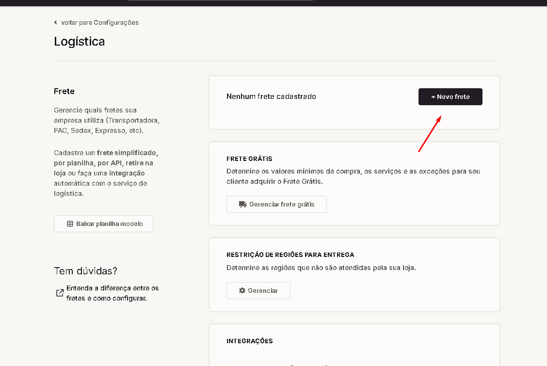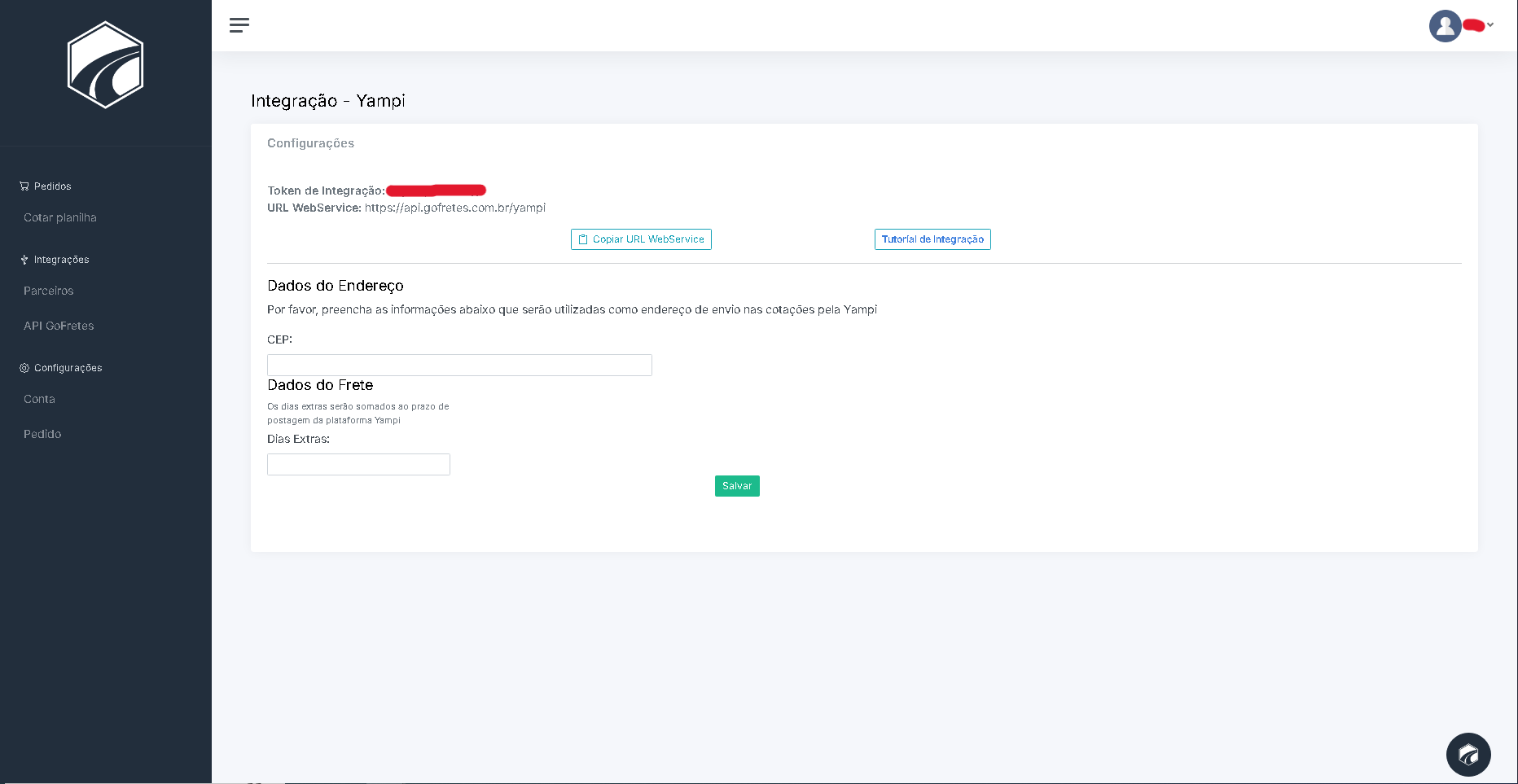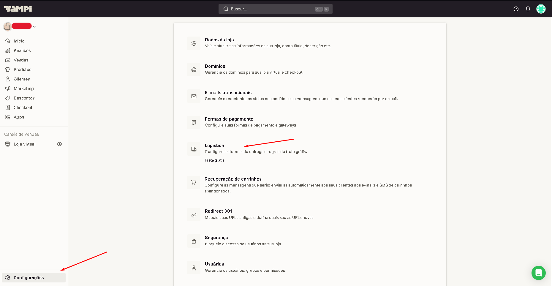 6. Após salvar, entre no site Yampi e Vá até Configurações > Logística