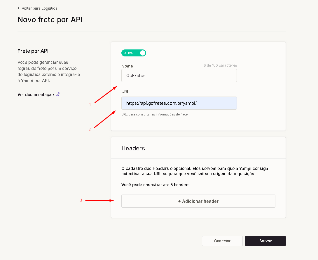 9. Insira um nome de sua escolha, como por exemplo ‘GoFretes’, e abaixo informe a URL de integração disponível no Passo 4.