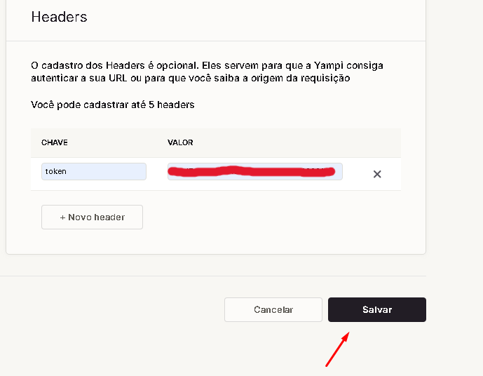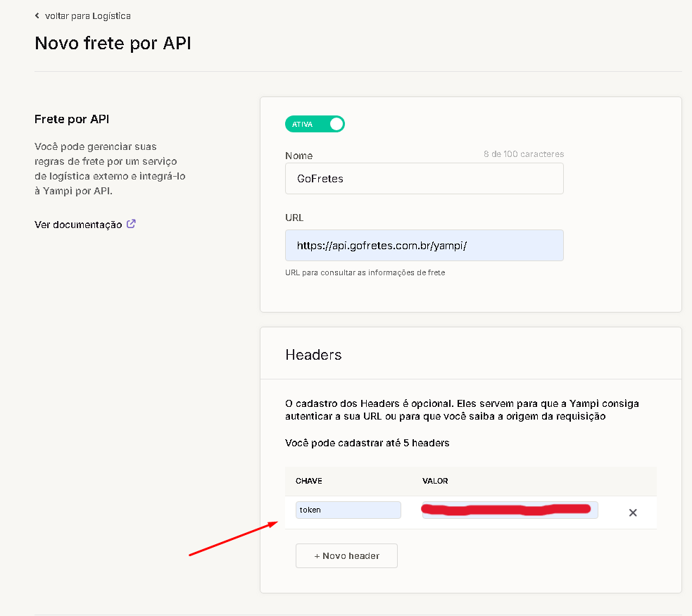12. No campo Valor, insira o token de integração disponível no seu painel da GoFretes (conforme foi apresentado no Passo 3). Essas informações permitem que a Yampi autentique suas requisições de frete corretamente.